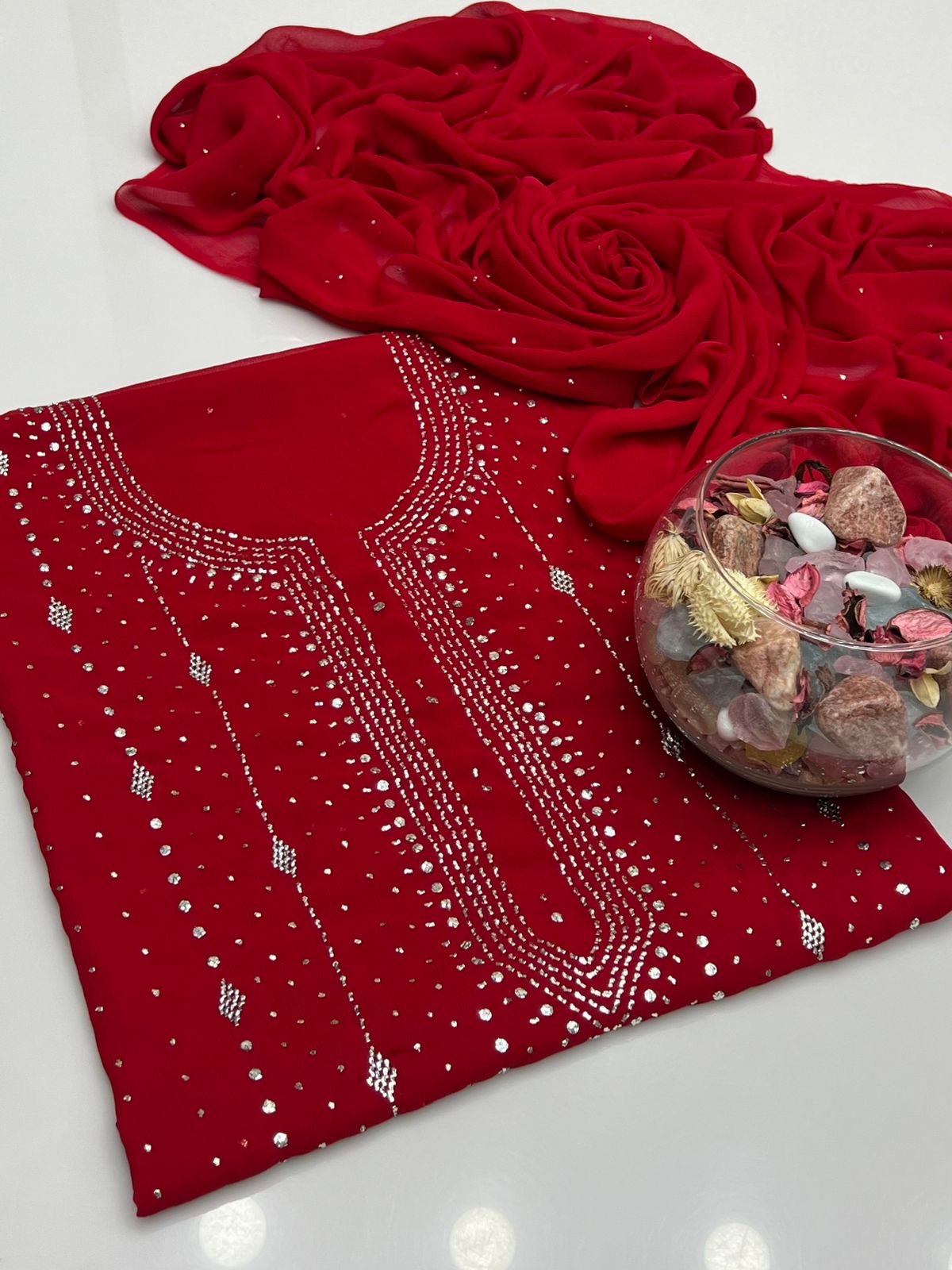 Handmade Barfi Mukesh Work On Soft Krinkle Shifoon Full Shirt Jall With Chatta Dupatta 2pc Suit…