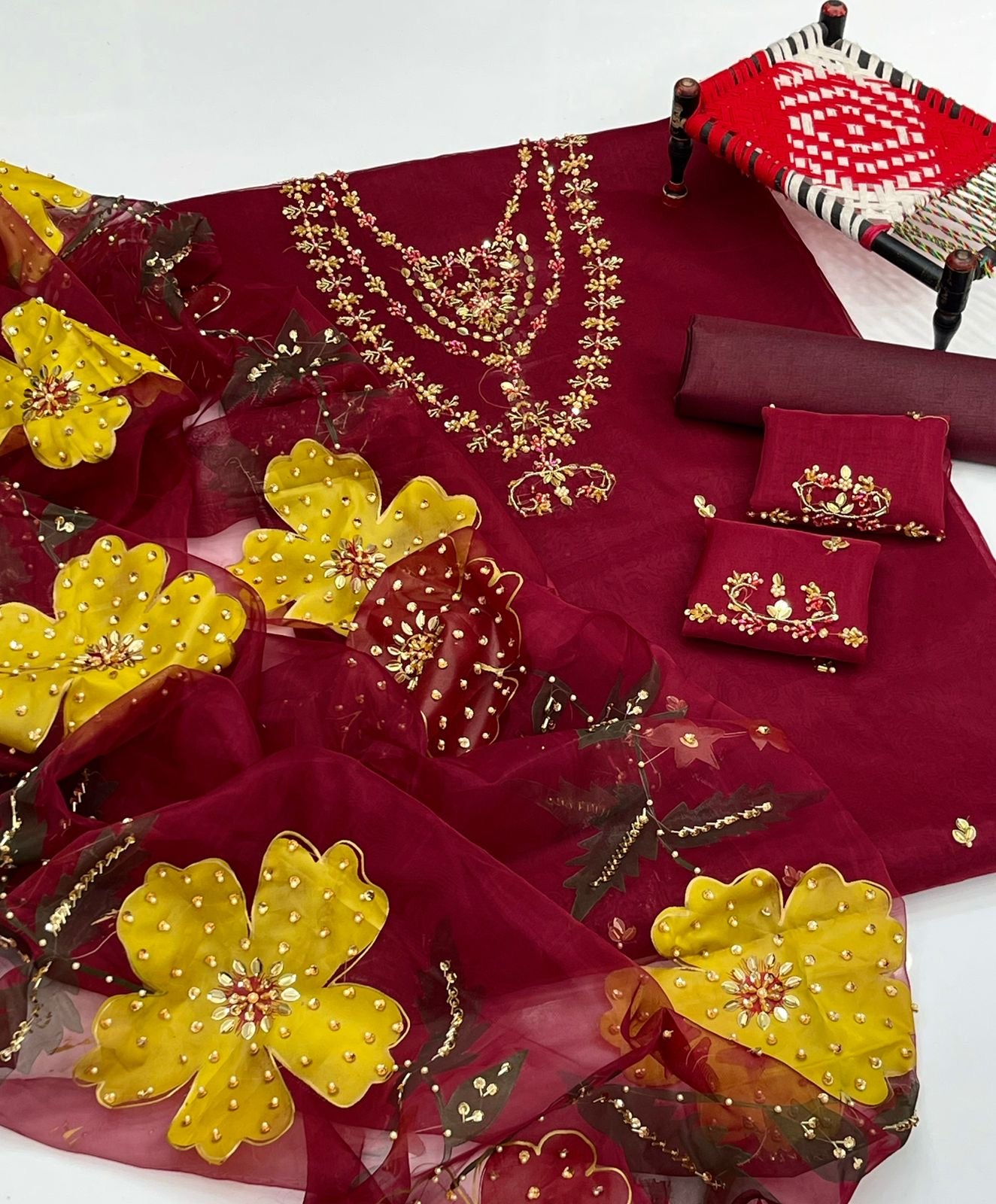 ✅ Handwork Zari Beads work oil paint organza dupatta Along with matching trouser