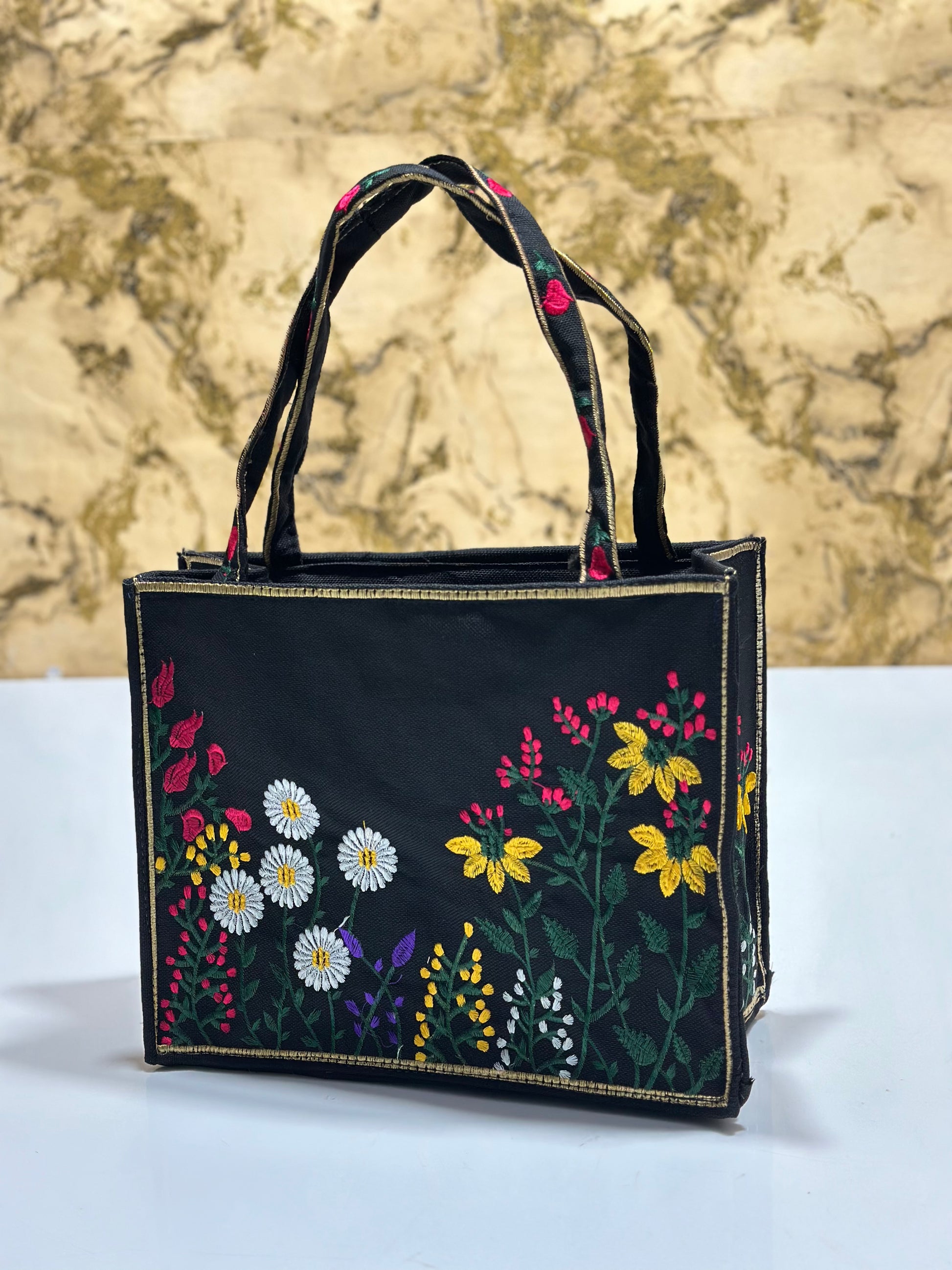 Traditional Jute Fabric Branded Front Back Flower Neat & Clean Embroidered Hand Bags With High Quality Inside Fabric With Zip 👜